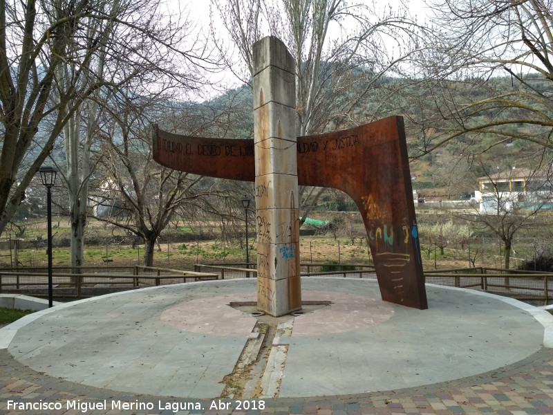 - Se trata de un monumento de arte contemporáneo con un pilar triangular central de hormigón semi rodeado por un brazo de hierro oxidado con la siguiente inscripción: HACER REALIDAD EL DESEO DE LIBERTAD, IGUALDAD Y JUSTICIA.