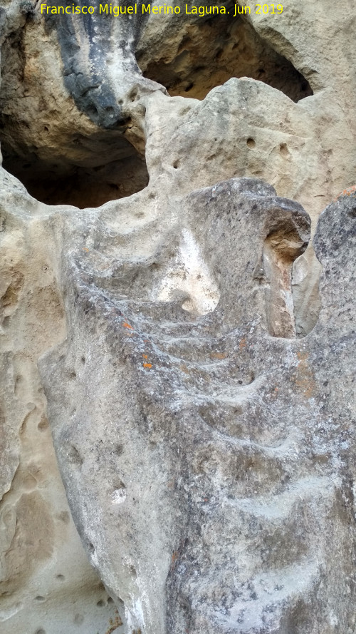 • El más alto, se trata de una cavidad irregular con dos bocas, tal vez destinada a depósito, se llega a ella a través de escaleras labradas en la roca.