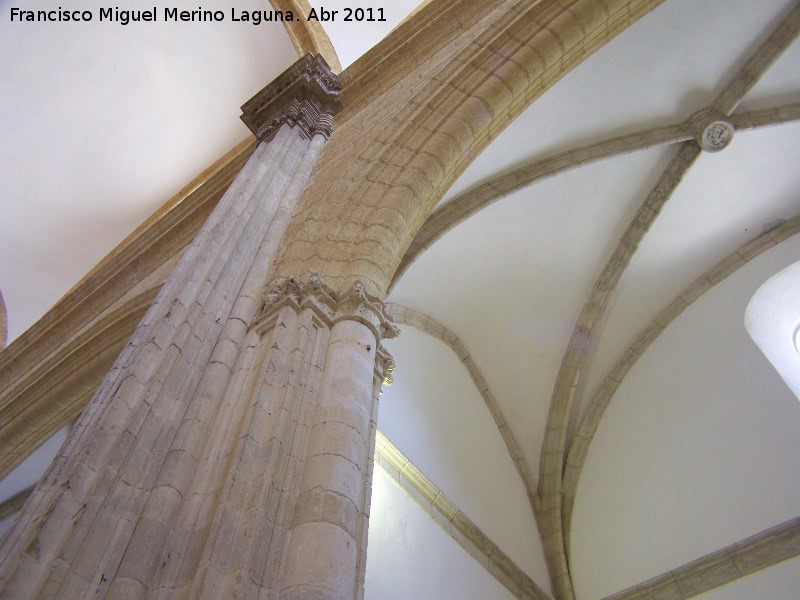 - Sobre columnas de piedra están labrados dos claustros, cuyos arcos escarzanos se apoyan en grandes ábacos decorados con grutescos.