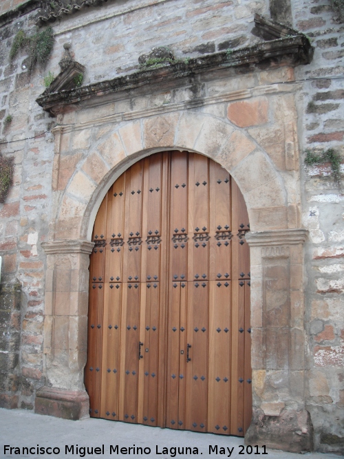• La fachada occidental presenta una portada con arco de medio punto con pilastras toscanas a ambos lados y entablamento con pináculos; y en su extremo, se levanta la torre de base cuadrada, campanario ochavado y chapitel.