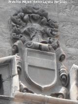 • La pureza de su trazado, rigurosamente italiano, con almohadillados y abovedados de gran elegancia, se une a la tradición vandelviresca por medio de las figuras humanas que sostienen escudos de la casa.