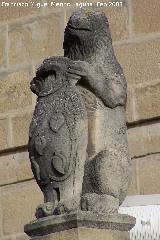 • En los extremos y a los lados de la escalera tiene un total de cuatro columnas bajas estriadas que sostienen a cuatro leones con escudo heráldico.
