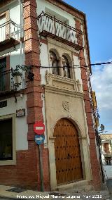 • En su esquina está la portada de arco de medio punto con escudo heráldico y sobre ésta una ventana con parteluz.