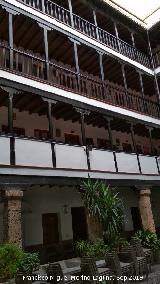 - El patio esta porticado mediante grandes pilares de piedra y zapatas de madera, que sostienen tres pisos con galerías abiertas mediante maderos horizontales o pies derechos.
