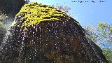 • Cascada que se forma una cortina de gotas y agua pulverizada al caer el agua sobre una colada calcarea, cubierta de musgo, que la dispersa, formando una especie de cueva de paredes de agua, a la cual es posible introducirse.